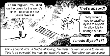 This web page replaces a more detailed but far more offensive web page that I (the First One) wrote on the same subject. I apologize in advance to people of faith for it being somewhat offensive and arrogant. But - some times I get off on a rant especially when I am surrounded by arrogant Christians trying to shove Jesus down my throat. If you read on you'll find my original rant that is more of a discussion than official church position. |